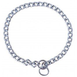 Collier pour chien. Le collier """"étrangleur"""" en métal gourmette est disponible en 4 longueurs : 65 cm / 70cm / 75 cm / 80 cm. Attention : La taille indiquée est la longueur totale de la chaîne, prévoir d'enlever environ 10 cm une fois la mise en place du collier au cou de votre chien, par exemple si le tour du cou de votre chien fait 60 cm, prévoir de prendre le collier en taille 70 cm. Le collier """"étrangleur"""" permet d'éviter que votre chien ne tire trop sur sa laisse, c'est un moyen efficace si il est bien utilisé : quand votre chien tire sur sa laisse, vous donnez un coup sec, en accompagnant votre action de l'ordre """"au pied"""", le collier va alors se refermer sur le cou de votre chien et il comprendra que lorsqu'il tire sur sa laisse, il ressent une sensation désagréable ! Attention, ceci n'est qu'un résumé, nous ne sommes pas éducateur canin et ce collier n'est pas une solution """"miracle"""" si votre chien n'a pas reçu une éducation et un dressage de base. Déconseillé pour les chiens ayant des problèmes respiratoires. Laisses en métal : consulter notre rubrique """"LAISSE POUR CHIEN"""".